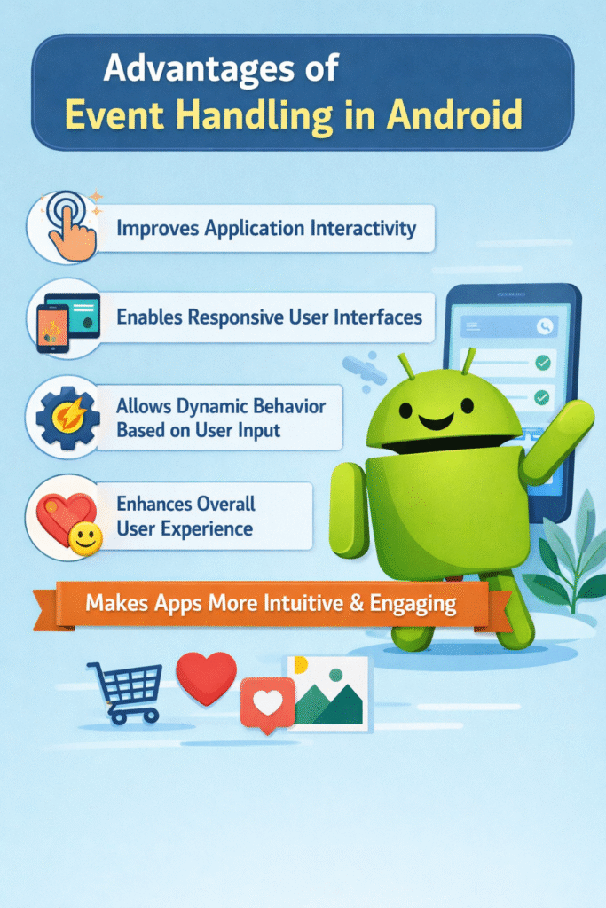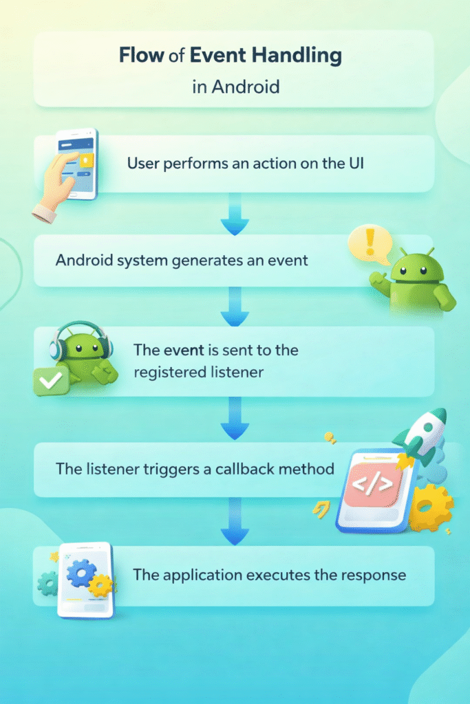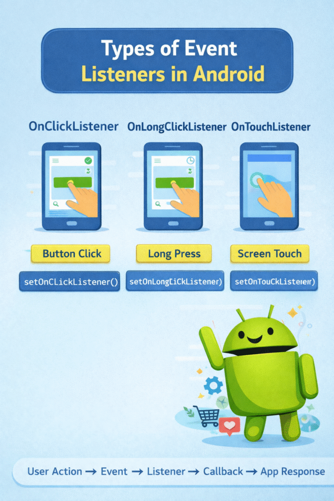 Event Listeners −An event listener is a component in Android that waits for a user action on a UI element (such as a button or image). When the user interacts with that element, the Android system automatically calls a method in the listener to perform a specific action.